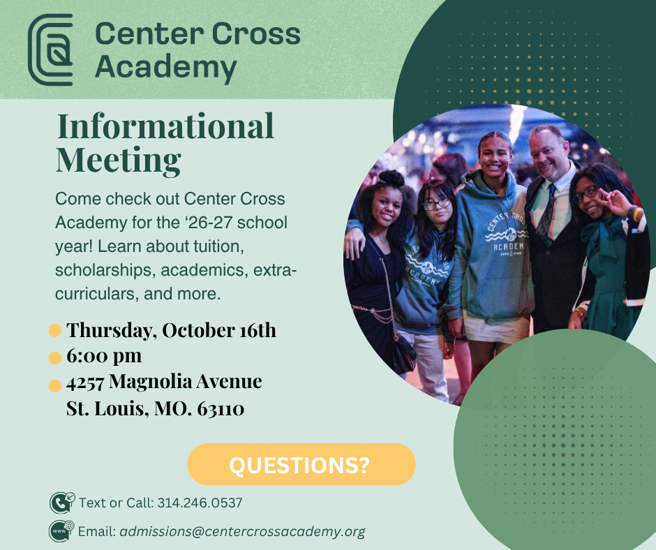 Center Cross Academy launched a new Christian High School this fall with the addition of 9th grade. We are eager to continue adding a grade each year until we reach a full K-12 school by 2028-2029. Set between the Missouri Botanical Gardens and Tower Grove Park in South St. Louis, we are equipping students in St. Louis City with a rigorously academic and biblically faithful education.